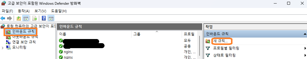방화벽 설정을 한 번 해본 적이 있었지만, 오랜만에 한 번 더 하려니 헷갈렸다. 또한, nginx 프로그램의 방화벽 설정도 열어주어야 외부에서 프록시 설정이 가능해진다. (이것 때문에 2시간 정도 날렸다.)