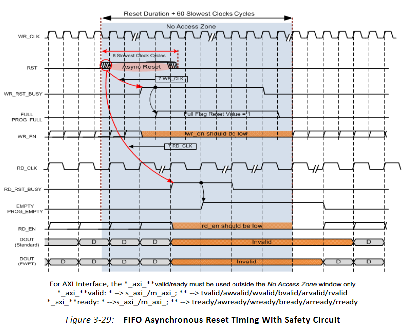 주의할 점은 FIFO 설정이 기본적으로 안전 회로(?)를 사용한다는 것이다. 이 기능은 내부 RAM에 도착하는 입력 신호가 동기식인지 확인한다. 이 경우 비동기식으로 재설정되면 60사이클 동안 기다려야 한다. 75MHz의 60 사이클이므로 100MHz 클럭에서는 대략 (100/75)x60 = 60 사이클 정도가 필요하다.