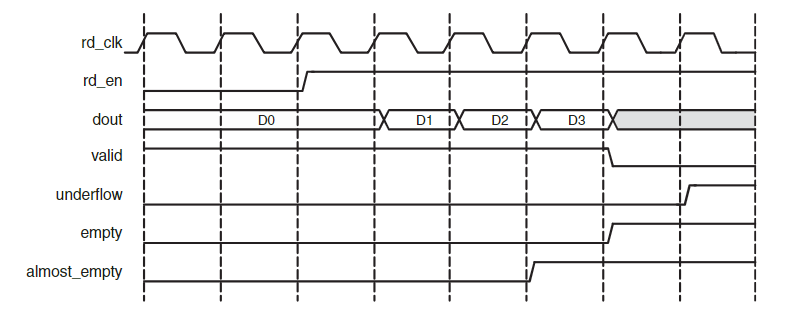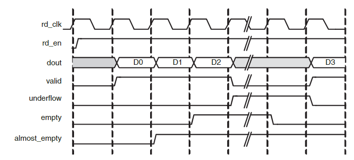 rd_en 신호가 High 면, FIFO 데이터를 읽고 다음 사이클에서 부터 데이터가 들어간다. valid는 데이터 유효 신호이고, Almost_empty는 읽을 데이터가 아직 남아 있음을 나타낸다.FWFT FIFO 읽기 타이밍
